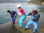 Our daily routine went something like this: quick breakfast and departing around 8AM. The areas we were assigned to were about an hour from where we were staying, so we arrived just after 9AM and began preparing the ropes, untangling them and fixing a lead weight to each one while the divers set up their equipment. Mornings and afternoons were spent pulling out as much stuff as we could find, after which we were rewarded with a quick soak in the local hot spring before heading back for the evening. My role was to stay on land and help pull out the rubble. The biggest pieces such as tree trunks were removed using cranes on the fishermen’s boat. A light truck was often used to pull other objects while each volunteer on land including myself was paired up with a diver. The diver would descend, while I threw the rope out and waited for the signal. Two tugs later and I would be pulling out fishing nets, fishing equipment, tree branches, poles, plastic bags or trays. The sea was also littered with buoys marking the spots where more heavy objects had been found. These were then lifted out with the arrival of the fishermen’s boat and crane. From a distance, the areas we worked in seemed fine. The sea was calm, visibility was pretty good and compared to immediately after the quake, a lot of debris at the ports had gone. But as we found more and more objects at each attempt, including plastic and broken bottles, carpets, car tires and wood, it became obvious that a lot still needs to be done. The saddest moment of all was finding a woman’s handbag and a snowboard.