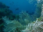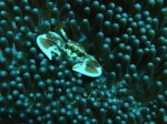 The dive began in poor visibility, although further down things became a lot clearer and we soon spotted some vast marine life. The top part of the wall, with some surge at the surface, mainly consisted of hard corals. We also spotted some hedges of gorgonians and dark (blackish?) coral bushes. Most marine life at the Drop-Off are attracted to the plankton that is swept by the current from the Tulamben slopes. My guide and I spotted a small and interesting looking yellow creature, some kind of a shrimp or crab, very noticeable against the dark rock, watching us as we swam past. We also saw plenty of anemones full of pink anemone fish, and even came across a white anemone crab with blotches of red and brown with his pincers in a slight upright position. Usually shy and elusive, they can be difficult to find unless a diver specifically searches for them, so we were quite lucky to come across one by chance.