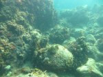 Arima: This is a sheltered bay only accessible by boat. There are even a few dolphins – we encountered a mother and baby at the surface. The rocks here are spread out at around 8m and there is a great sandy area at around 12m where you can literally rest face down and look up at the sun streaming through the water. We spent a good 15 minutes or so scanning the water, waiting for anything to roll in. With rocks and boulders to our left, we swam across this sandy area and after rounding a corner an incredible site materialized in the distance – a school of goatfish perfectly ordered and resting on the sand in the slight current. Unbelievably tame, they watched us intently and even let us swim directly above them as we continued on our journey. The rocks were full of life – eels displaying their menacing jaws, a bright yellow baby box fish appearing like a ray of sunshine and a round ribbontail ray devouring its latest meal.