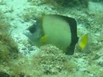 Dive 2: Uonone: depth: 14.0m, dive time: 34mins, water temp: 24C, entry time: 12:03, exit time: 12:37, average depth: 9.6m, used a 10L steel tank, 5mm wetsuit, 3mm hood/vest and 3kg back plate with 1kg extra weight in pocket. Start pressure: 180 bar, End pressure: 80 bar. Saw damsel fish, angel fish, schools of yellowstriped butterfish and large scale blackfish.