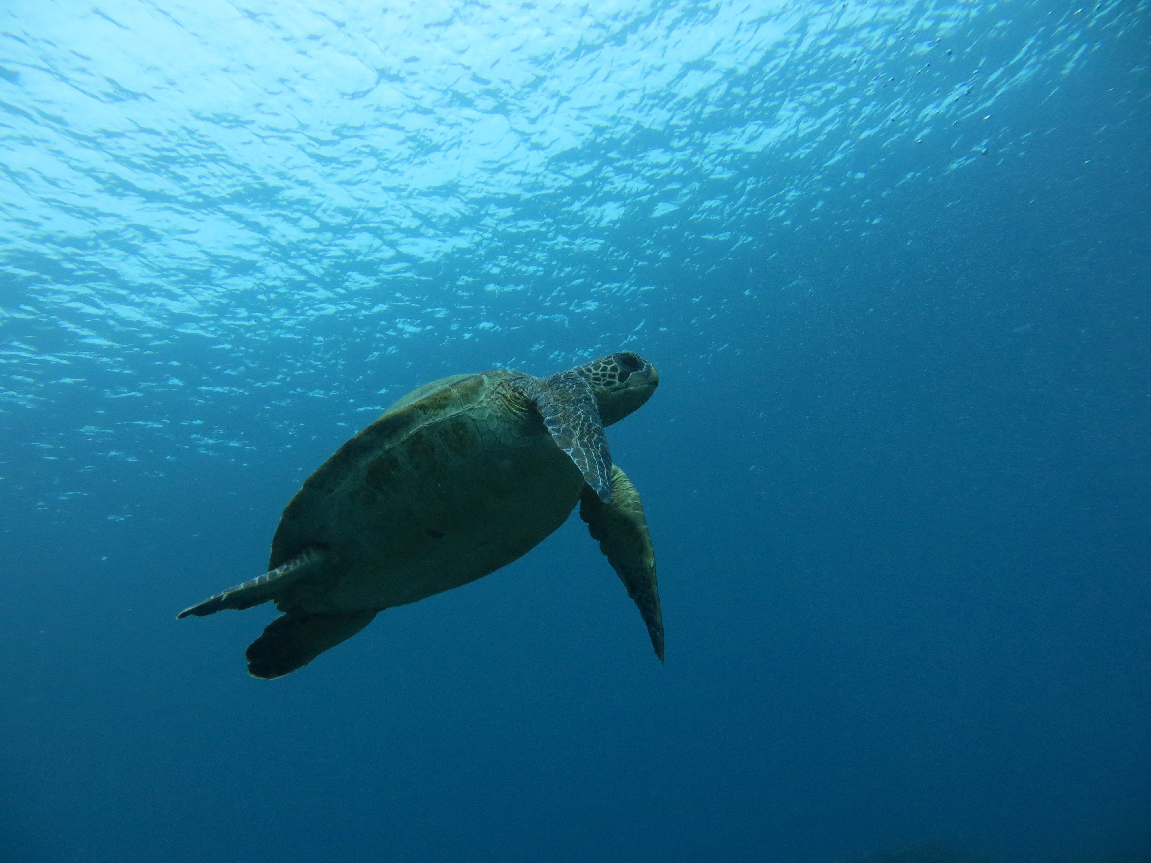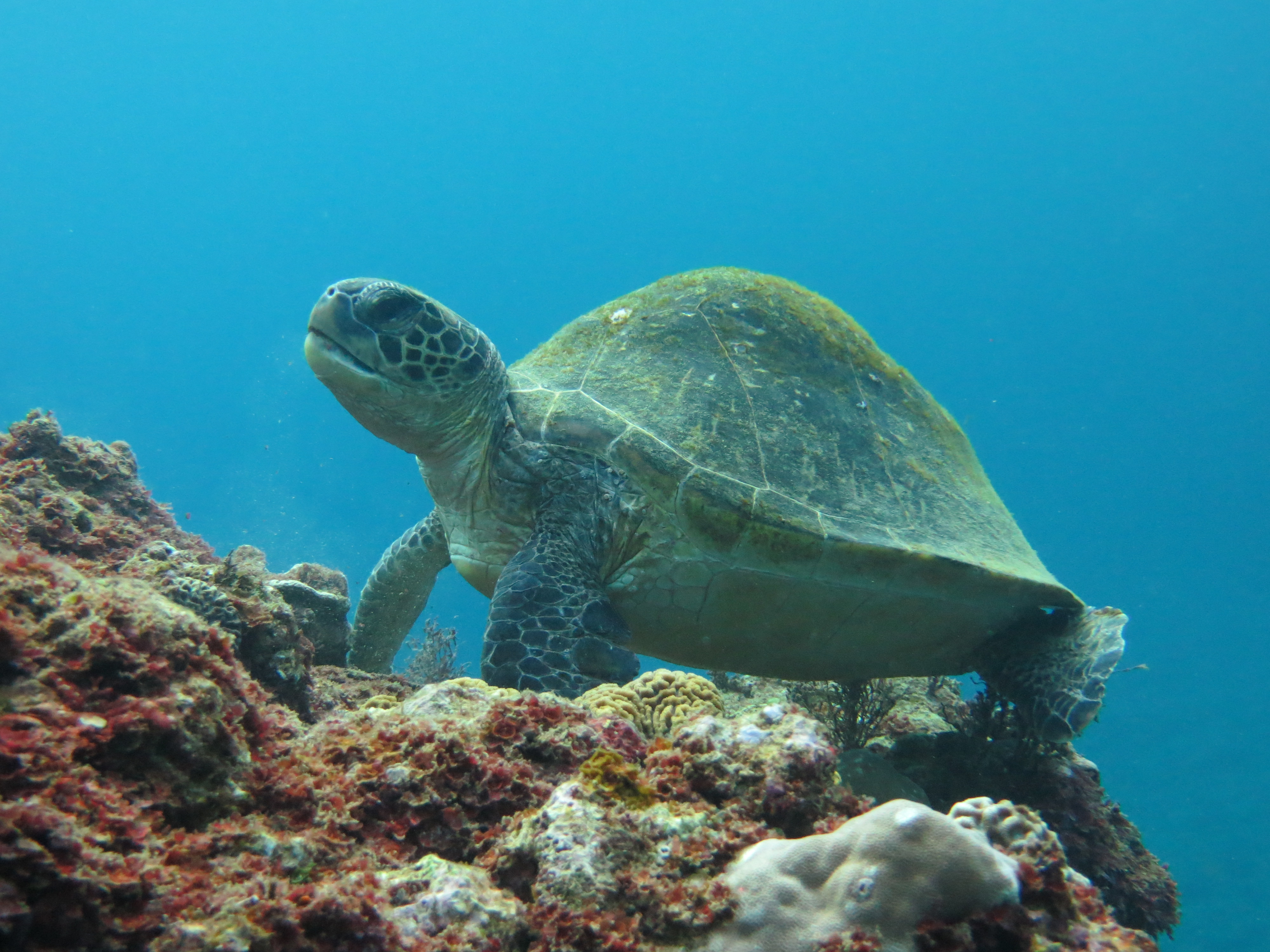 Shiotobiya, only about 10mins away from land, consists of flat, small and medium-sized rocks strewn here and there. At 17m is a sandy patch that is home to the jawfish, a comical and entertaining little creature with a large head, mouth and eyes relative to its elongated body. It constructs burrows, spitting sand at anything that comes too close and curiously peering out to see what’s going on around it. Macro lovers can lie flat and attempt to get some close up shots but this requires excellent timing as the jawfish darts out of sight immediately if it wants to. Shiotobiya is also home to Yamachan, Tokunoshima’s famous green sea turtle that’s been around for over 10 years. Tame and relaxed, he is known for his unusual mountain-like shell and is normally found swimming or grazing off the rocks at around 10-15m. As this is a relatively shallow depth, the rest of the dive can be spent in the company of Yamachan, swimming with him and taking photos.