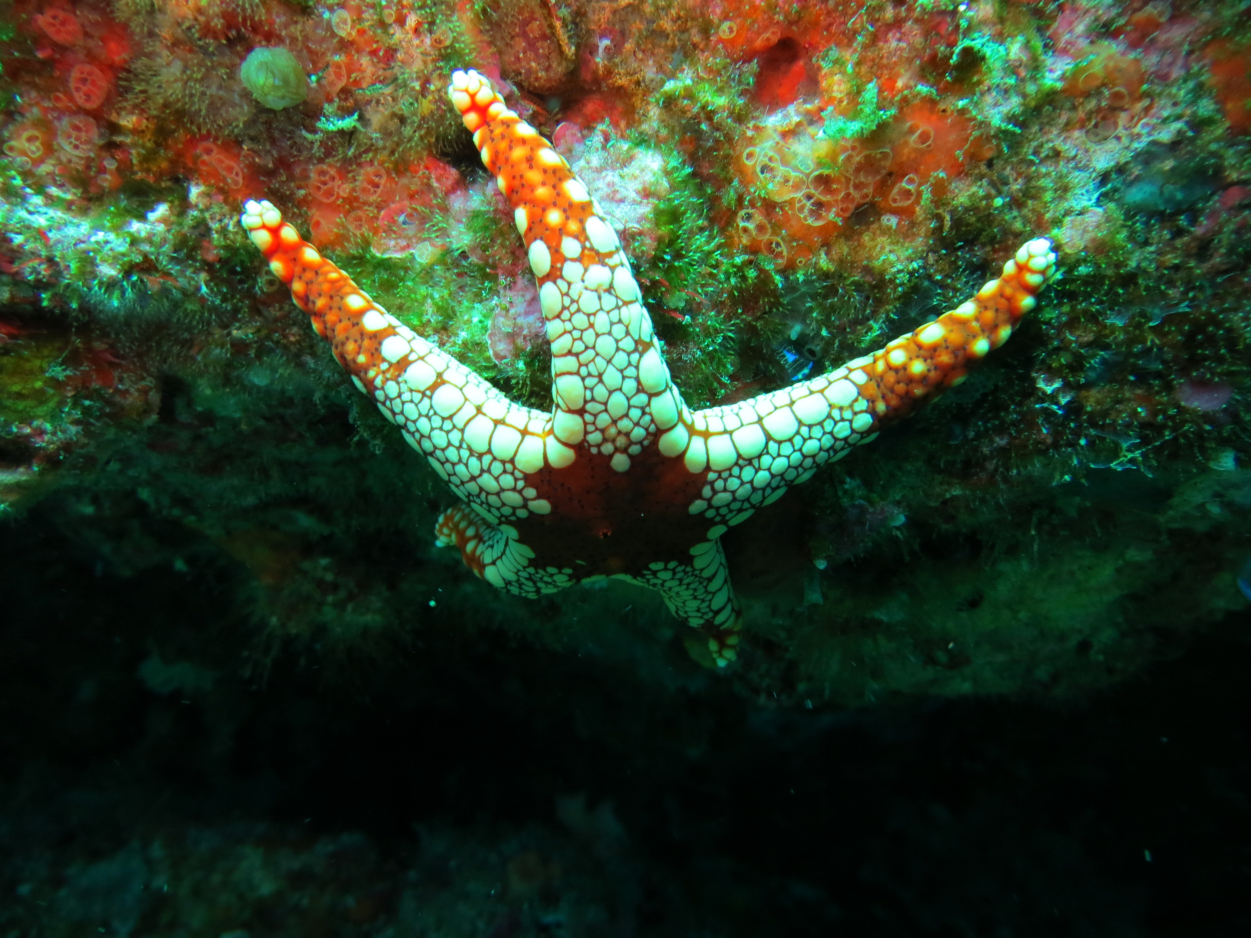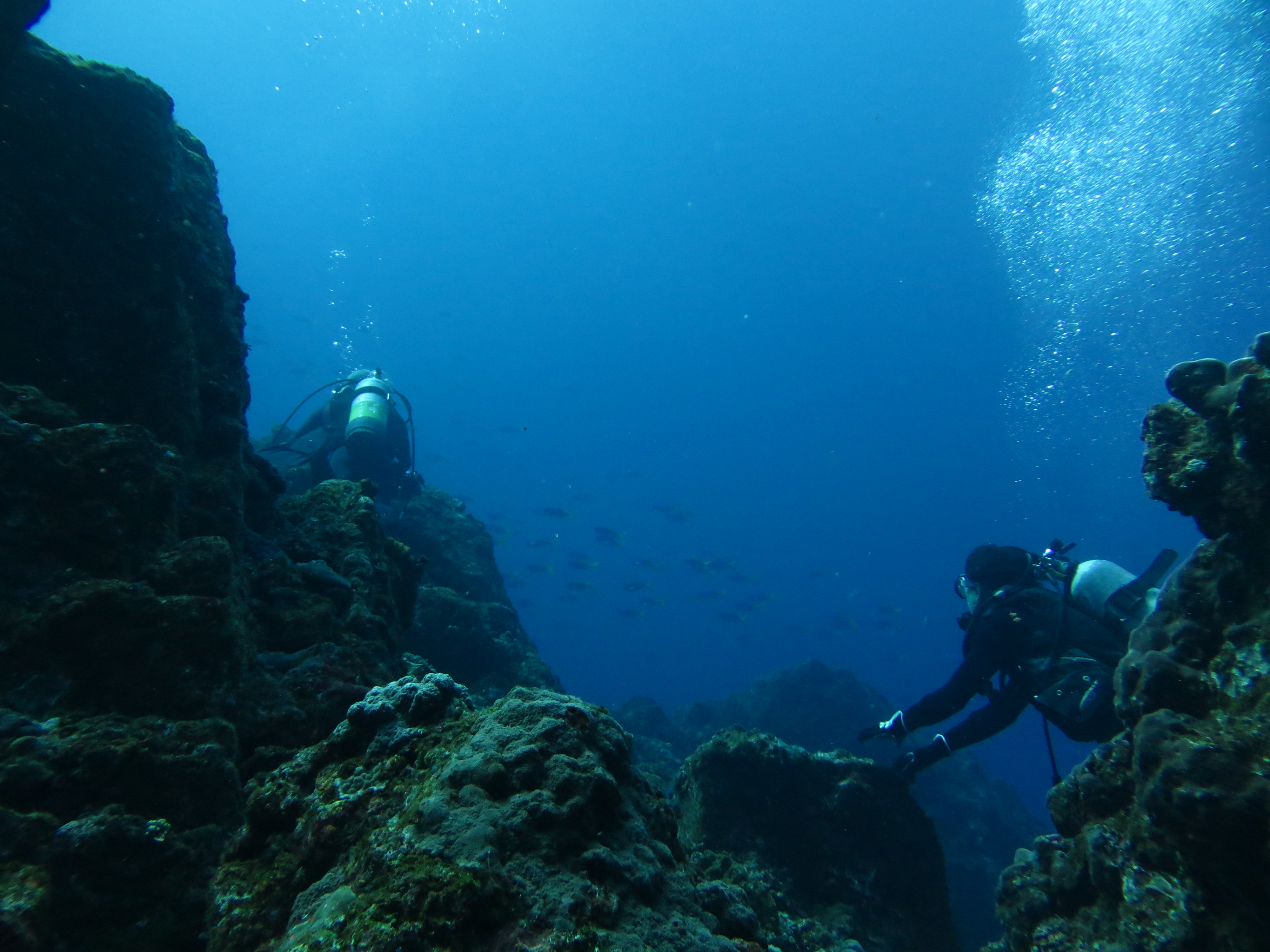 Divers don’t often get to visit Tonbara Iwa due to its strong unpredictable currents and location 30mins away in the open sea. However, it is Tokunoshima’s most favourite and challenging point – three small offshore rock islands that are home to large tuna, giant trevally and other pelagic species. Because of the slightly demanding conditions, divers must hold onto an anchor rope as they descend to around 20m. Already the current picks up so most of the dive involves crawling slowly over huge tower-like rocks to a maximum depth of 30m. Sometimes we found ourselves perching on rocks, peering down into the dark blue depths below so this site is not recommended to those with a fear of heights. The shallower waters (around 20m) are filled with tropical inhabitants including starfish, redfin fusiliers, white tip reef sharks and large clown triggerfish. Overall this site requires a fair amount of experience and preferably advanced open-water training.