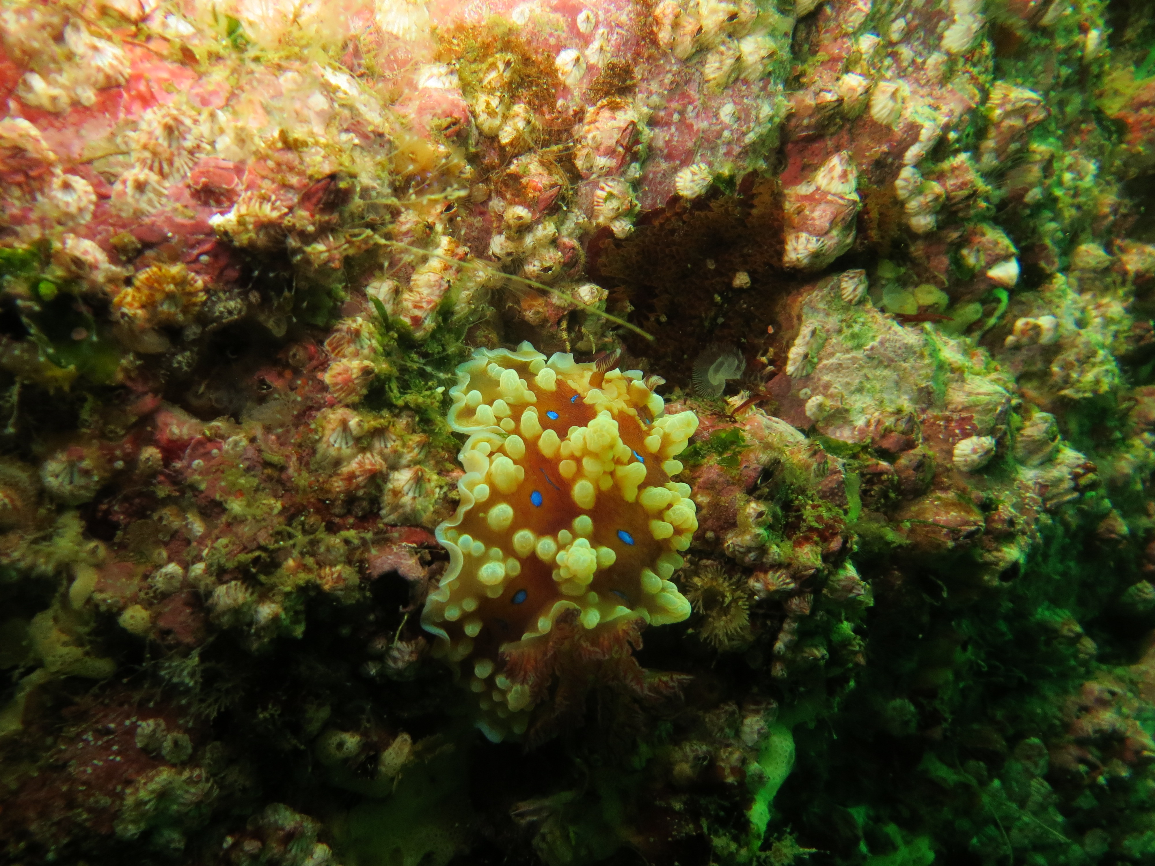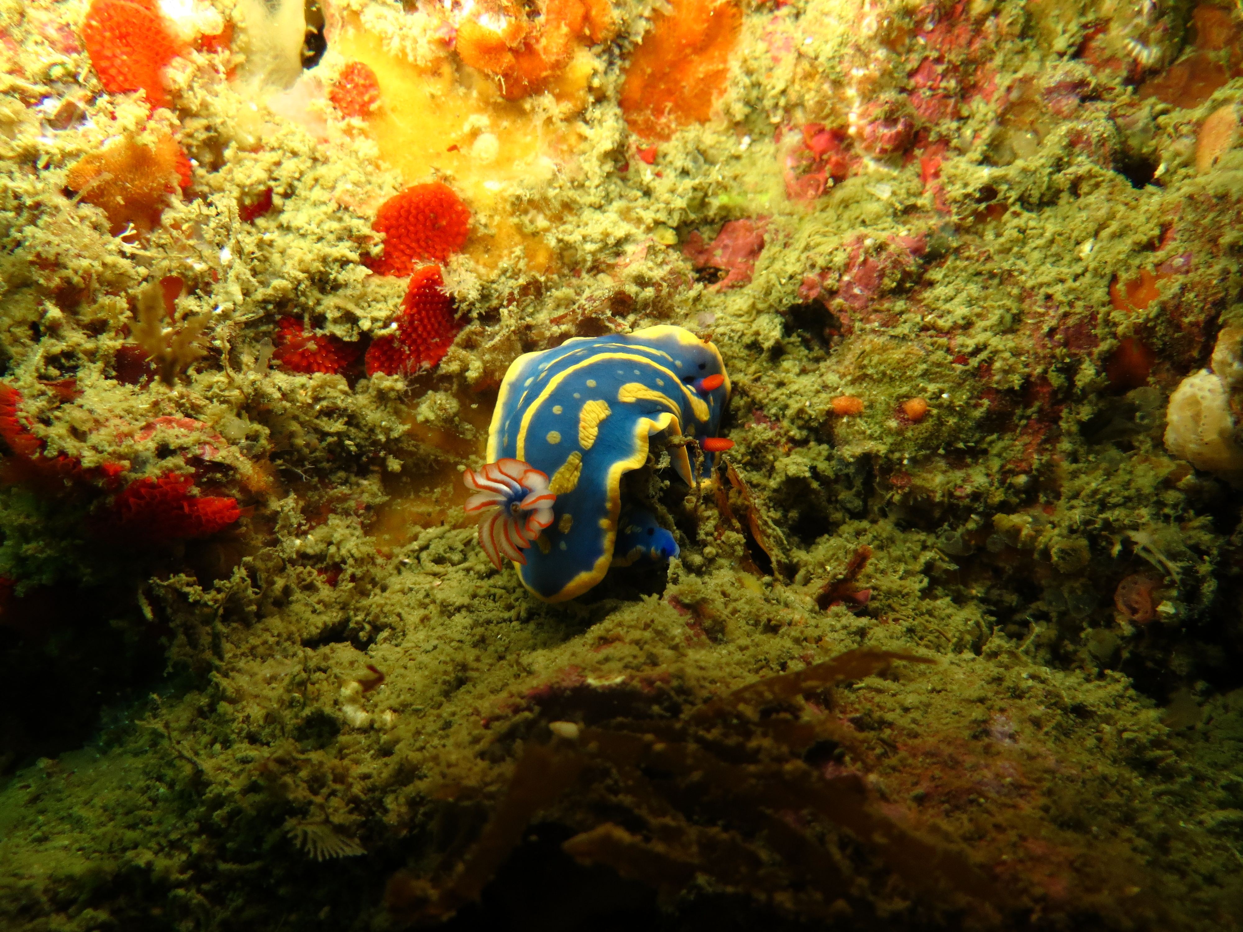 Nagizaki: This site is just off Oshima island, the largest island in Wakayama prefecture and 1.8km off Kushimoto. It’s a huge rock formation that’s covered with a riot of life, a smattering of soft coral, nudibranchs and dense rich colours. We dived soon after some bad weather so visibility was not perfect but in the murky water our torches still revealed a wonderland of activity such as soft corals jostling and swaying for nutrients. Descending from the boat to around 7m, we swam down to a maximum depth of around 25m before turning around and heading back to the boat extremely slowly, stopping on the way to marvel and photograph everything around us.  There were many great sightings during the dive, things as obvious as schools of fish, or others that were more hidden away, such as delicate anemone shrimps waiting and watching amongst the tentacles. Decorating the rocky walls were some white chromodoris sea slugs and festival sea slugs with bright blue bodies and yellow markings, while strong and angry-looking sea urchins were found in every crack and space, sometimes accompanied by tiny red urchin clingfish hovering delicately in front of our cameras.