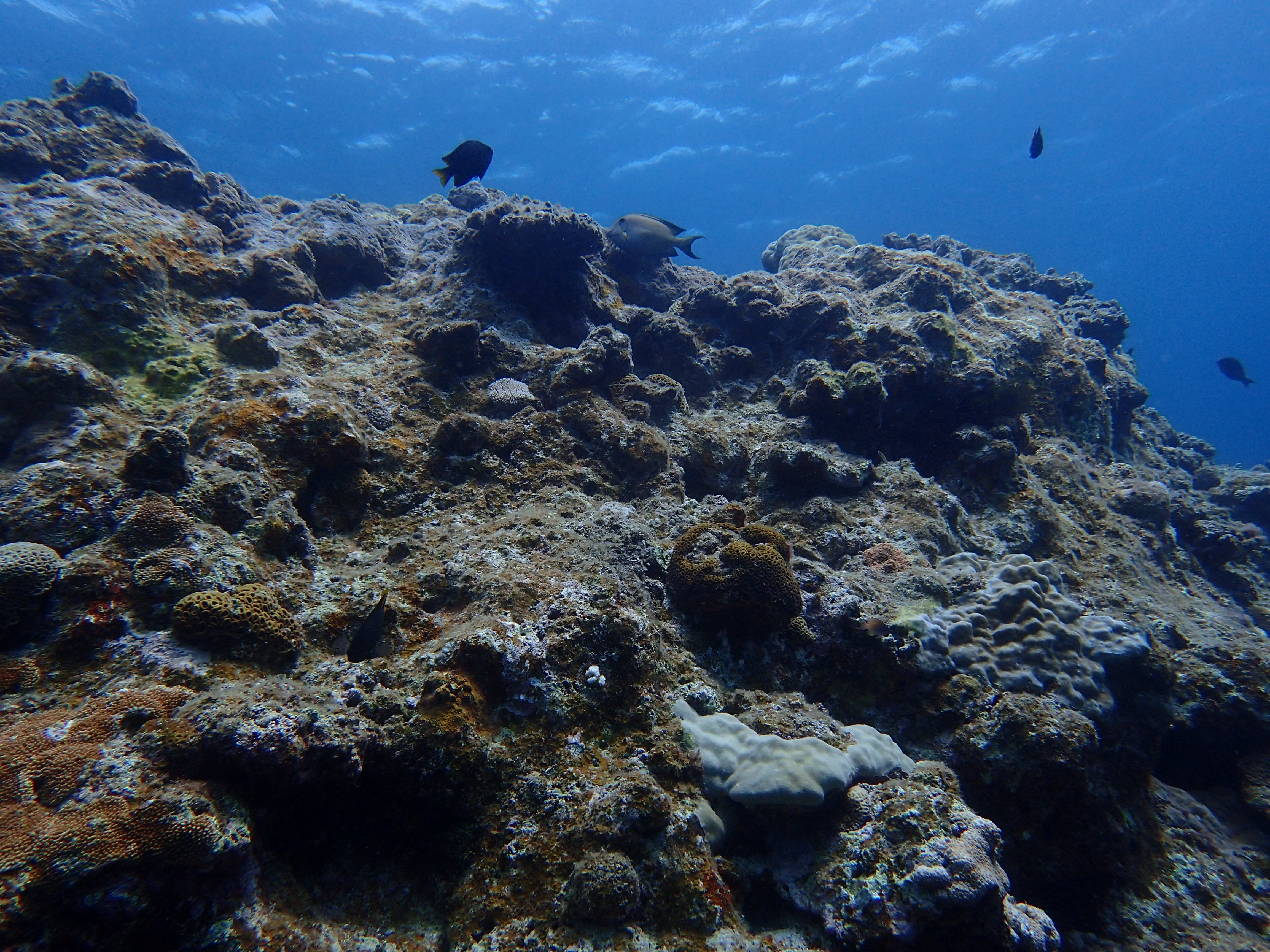Mini Grotto: Mini Grotto is the perfect example of Miyakojima’s colossal rocky structures and tunnels. A boulder-strewn seabed slopes gently into the deeper depths, and a turtle sways back and forth, trying to munch on food it had found on the surface of a rock. This site also offers a small tunnel ideally suited for open water level exploration. Divers can easily enter at around 15m, penetrating the semi-darkness with their flashlights and swimming up and up towards the surface of the water as the sun streams into the opening, creating a spectacular scene. Popping up above the water, it’s clear that the surrounding structures were carved out by waves centuries ago, and divers can float on the water, lie back and marvel at the immense beauty before them. The only way out is back through the same tunnel but although it mainly consists of sediment, small rocks and gravel, it’s worth taking time out to study the nudibranchs that have found their way inside. Back in the shallows, shoals of chromis move into open water to feed on drifting plankton.