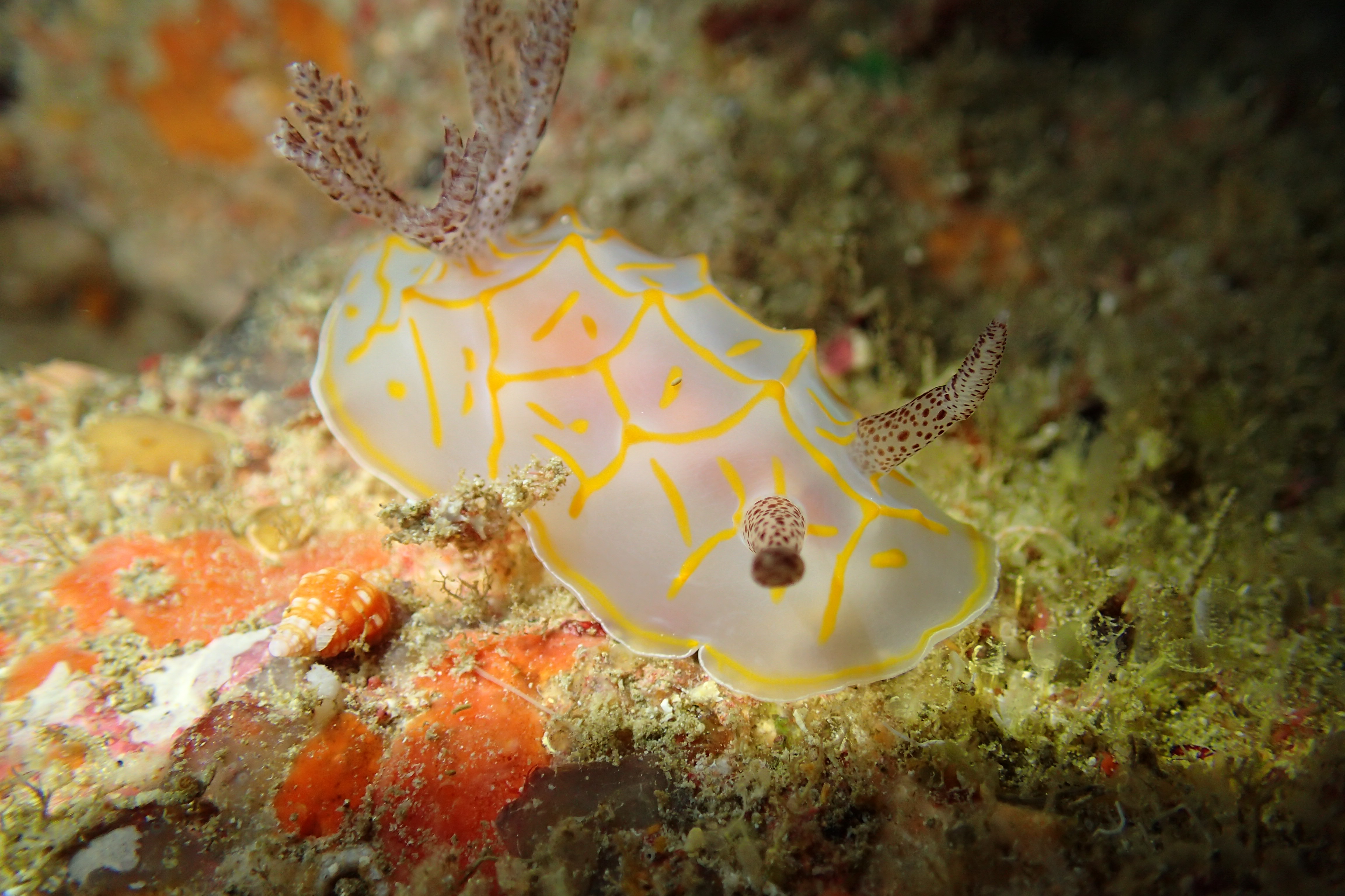 Nakanoshima Channel: This site allows divers to explore walls and swim-throughs created when the ocean worked its magic on the volcanic rocks a long long time ago. The rocks here slope to a 14m-deep seabed over a jumble of medium-sized boulders that make an ideal habitat for all manner of darkness-loving marine life. Swimming through a narrow arch and then down to around 18m, it’s clear that the rocks are covered with sponges and other critters thriving in the nutrient-rich waters. Juvenile parrot fish gently hover close by, while tiny jawfish also peer out from holes in the sand, gripping tightly as they sit and wait patiently for divers to move on or darting quickly out of sight if so inclined. Close to this sandy spot is the entrance to a small tunnel, which seems to promise encounters with little creatures. As we swam in, we hunted their nooks and crannies and spotted a shoal of red soldier fish sheltering deep within. As the dive comes to a close, the tunnel spits you out with a tiny bit of surge, topping off a fun dive as you begin your ascent while closely examining a range of colourful nudibranchs.