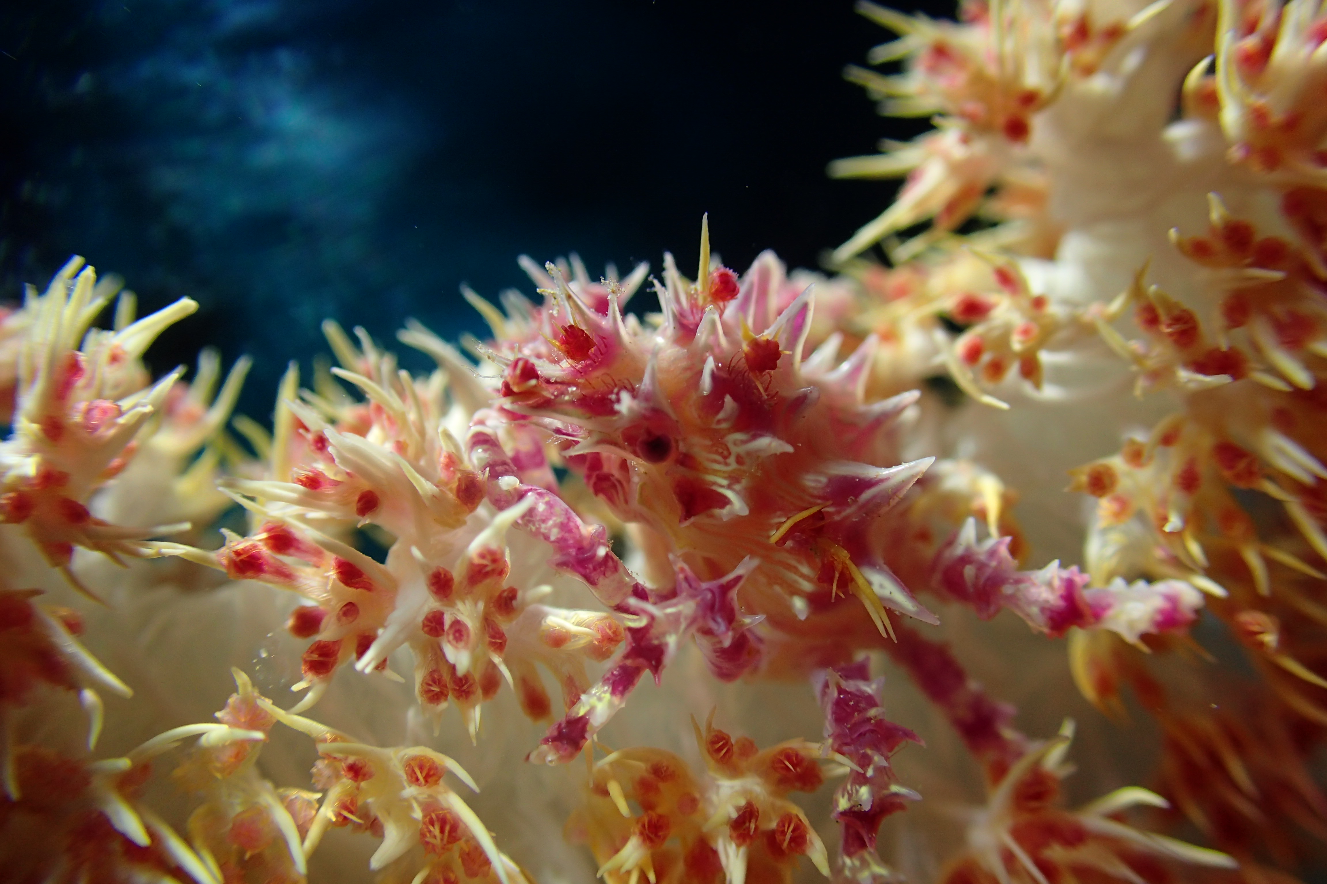 Mao no Kyuden: A large boulder area and labyrinth of tunnels offers an air of mystery and anticipation. With a maximum depth of around 25-27m, divers can’t spend too long here before reaching no-decompression limits, but even a short time spent at this point will reveal some form of life such as red soldier fish making a hasty retreat with their fins fluttering. The structure here seems to consist of several large chambers and tunnels linked together and although divers are never far from an opening, it can sometimes be hard to tell where you are going. Swimming towards the exit past shoals of fish, the immense beauty of the tunnel reveals itself and taking photos, divers are framed against an iridescent blue ocean, enveloped in a velvety blackness. At the surface, nutrient-rich water swirls around, giving life to vast schools of fish such as filefish and sweepers competing with one another for space. Don’t forget to visit the candy crab at 21m, a cute little critter that’s well camouflaged against a piece of soft coral.