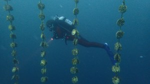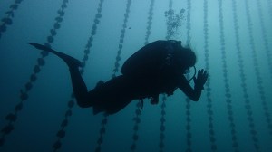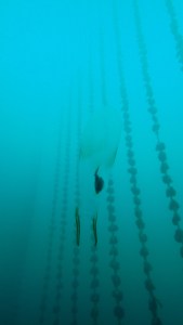 This month I returned to Tohoku for a few days to join Sanriku Volunteer Divers in inspecting Koishihama’s underwater scallop farm.  After a 5-min boat journey out into the bay, we began our descent into the cold and murky water.  Visibility wasn’t the best, so we stayed close to a fixed rope as we swam to around 5m.  I seemed to be descending into an area devoid of life that opened out into more and more deep blue water, although the water was clear enough to make out some rock formations below and an impressive drop away into the blue.  My light cast eerie shadows over the rope, highlighting clusters of sea squirts and mussels as well as tiny feeding fish and little critters.