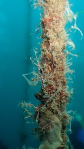 We’d arrived at Koishihama’s underwater scallop farm, each rope encrusted with healthy-looking scallops and sea squirts, with bits of kelp and seaweed swaying gently in the mild current.  These filter feeders growing into the current were more impressive than other growths I’d seen before.  Gliding weightlessly through the water, we spent 30mins swimming through the structure and floating next to it, using our torches to see whether the scallops were opening and closing, whether they looked healthy and whether any had died and dropped off the ropes.  We were also on the lookout for debris such as nets, wires or plastic bags that had become entangled with the ropes, removing these as we went on our journey. At just over 20m, it’s all too easy to forget how you deep you are here as you become engrossed in the work.  Ascending to the surface later on, my torch caught on some small sea cucumbers and scurrying shrimp-like critters as I passed by.