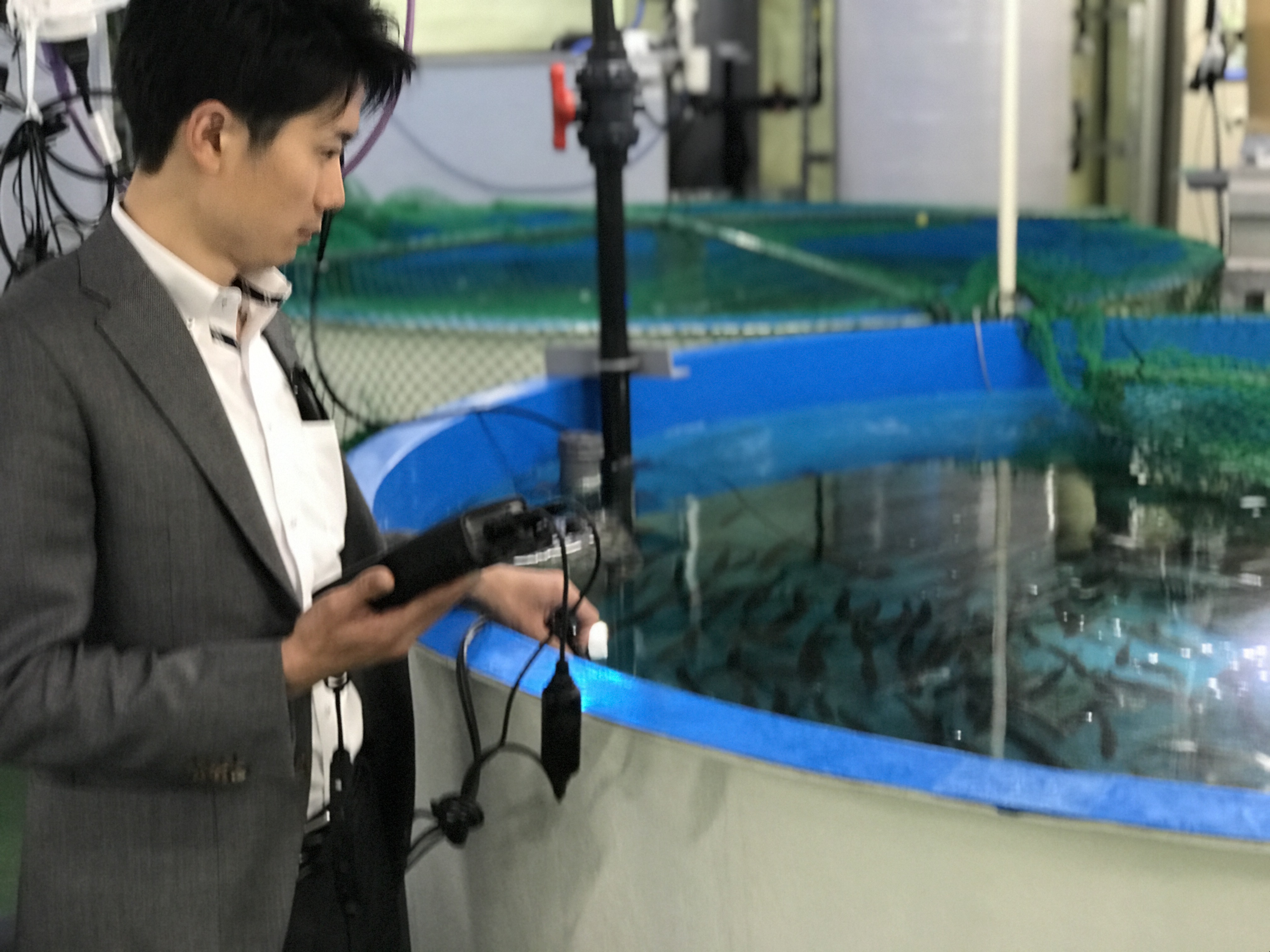(Photos below: FRD Chief Operating Officer Tetsuro Sogo monitors water conditions in his land-based salmon farm. Credit: FRD Japan)