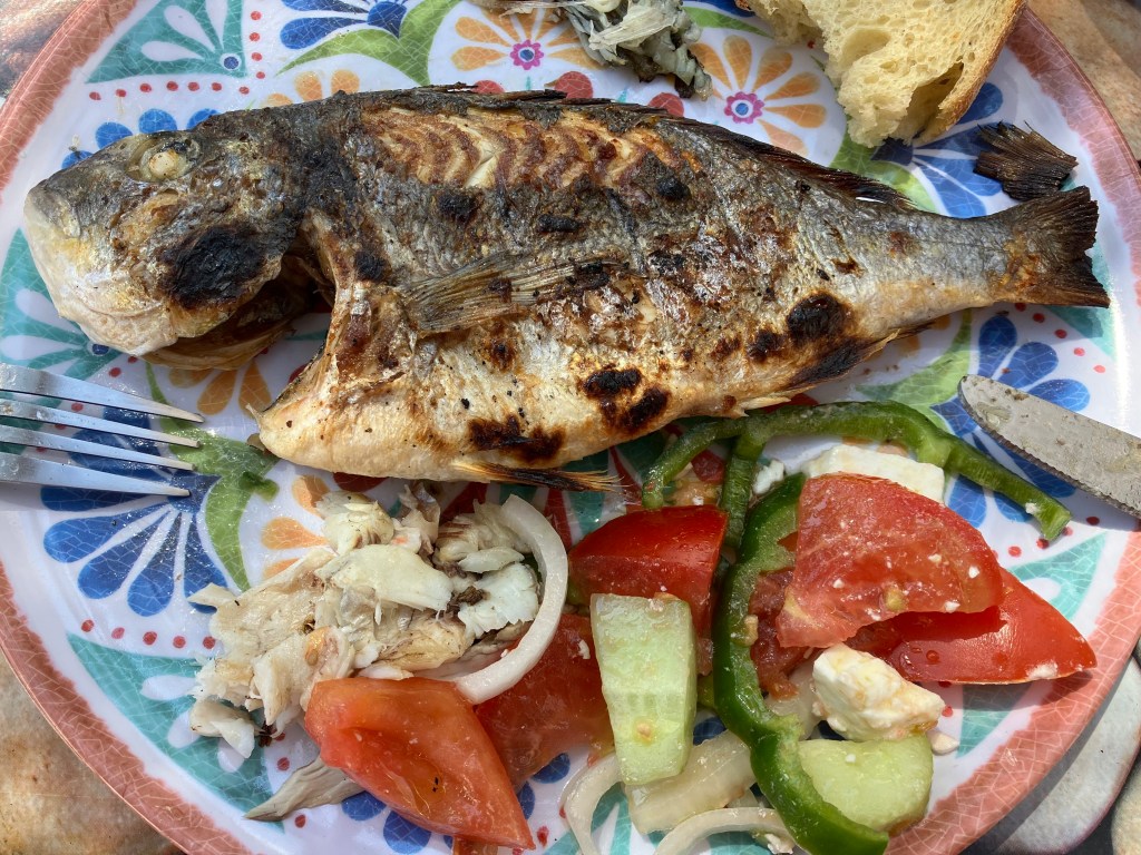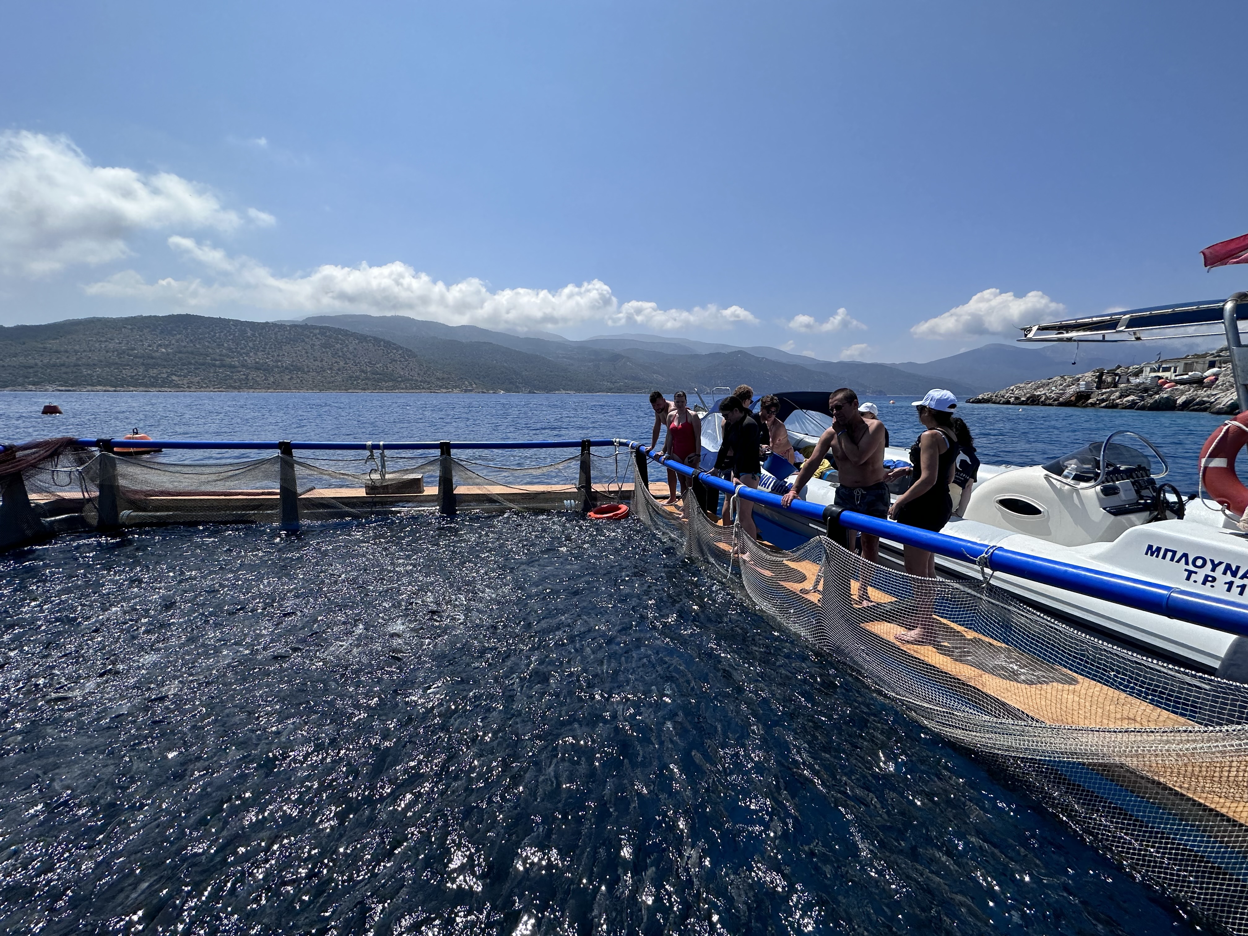 The trip took me to Lamar S.A, a small-scale farm that produces around 300 tonnes of sea bream, sea bass, meagre and gilted sea bream each year on the west coast of Rhodes. Together with Blutopia Diving Center, which offers local scuba dives, Lamar S.A runs educational marine biology trips and diving excursions to an island called Strongyli. Tourists learn about sustainable farming practices and become familiar with fish farming while encountering dolphins, tuna and seals that aggregate around the farm site. During the tour, we heard about the necessity for aquaculture growth in Europe, the relationship between aquaculture and the marine environment, and the importance of environmental protection. By far the biggest highlight was swimming with sea bream in a designated net pen. Close to Lamar S.A.’s net pens, the sea is a hub of biodiversity. On the day of my first tour, dolphins passed our boat all the time and seals made the occasional appearance, while tuna can also be seen swimming in between the cages.