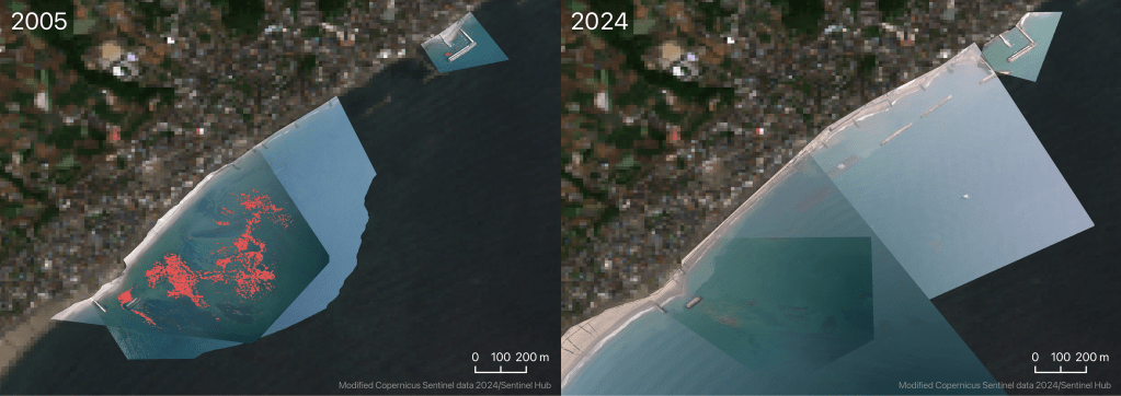 It’s also encouraging to see companies paying attention to blue carbon projects, not just because of their environmental benefits but also for their co-benefits such as protecting coastlines, supporting fisheries, local communities, hospitality and tourism, and providing cultural value. In Japan, these co-benefits have been, and still are, greatly emphasised. In the meantime, tech firms are also getting in on the action. Last month, Japanese/Singapore firm Umitron shared with me some more information on its work in Miura Peninsula near Tokyo. Making use of its AI expertise, the company was part of efforts to map eelgrass beds in the Miura area. Using aerial photographs from 2005 and 2024, advanced AI image analysis technology was employed to detect and map eelgrass beds in Miura with high precision. The result was an eelgrass map that was generated based on areas with clearly visible and identifiable eelgrass beds from selected areas. This type of work makes it possible to rapidly and accurately assess the current state of critically important habitats like eelgrass.