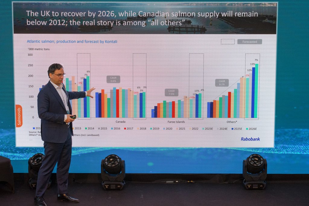 Meanwhile, GSA’s annual updates on fish and shrimp aquaculture gave a picture of the sector in 2024 and predictions for the next few years. Scotland’s salmon production is likely to be up by 15 percent in 2024 compared to 2023, said Gorjan Nikolik, global seafood specialist at cooperative bank Rabobank. He predicts that salmon production in Scotland will continue increasing in 2025 and 2026, rising by an estimated 7 and 6 percent respectively, while production in the Faroe Islands and a number of other smaller salmon-farming nations is looking promising. For example, Iceland’s salmon production is set to see 24 percent growth in 2024, and this growth is predicted to continue. Another key takeaway was that after two challenging years, Norway’s Atlantic salmon production is also likely to grow. On the topic of salmon, it was  encouraging to hear Tavish Scott from Salmon Scotland and Gilpin Bradley, a respected leader in the Scottish salmon farming sector, discuss the wave of negative media that salmon producers face, and emphasise issues such as transparency and the need to educate consumers.